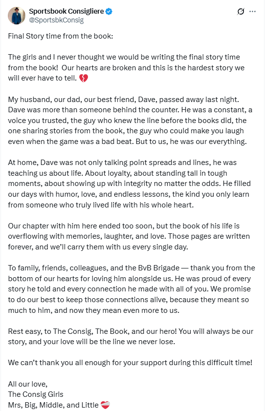I never had the pleasure of meeting Sportsbook Consig in person, but every interaction online and on my several appearances on Bostonian vs. the Book, Dave was so upbeat and gregarious that he was infectious. Dave was the real deal and as authentic as they come; the same in our public and private conversations. I will sorely miss his Charlie Murphy gifs whenever he agrees with something I said.