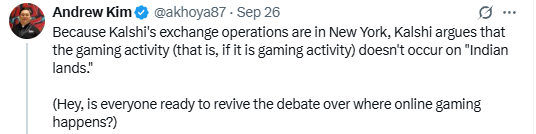 Kalshi is also arguing that bets placed by users on tribal lands do not constitute doing business there, arguing that it “does not maintain an office on Indian lands. Kalshi does not house servers on Indian lands. Kalshi does not employ personnel on Indian lands. Kalshi conducts no business whatsoever on Indian lands.”