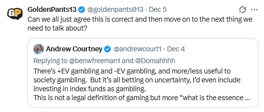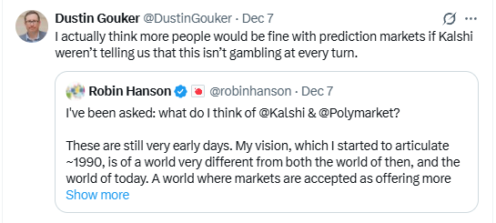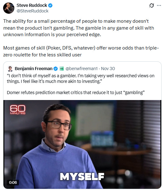 I’ll discuss this in greater depth in the future, but the “are prediction markets gambling” discourse is getting out of hand.