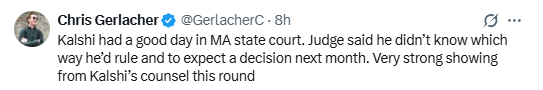 I’m always cautious of reading too much into what a judge may be thinking (and a decision isn’t expected until next month), but if you are Kalshi, you have to be pretty happy with how things went down in Suffolk County Superior Court in Massachusetts yesterday.