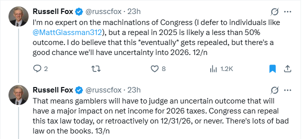 Circling back to the FAIR BET Act town hall, tax lawyer Russell Fox wrote an interesting X thread expanding on his thoughts: