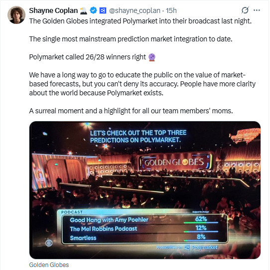 An interesting thing happened last Sunday, during the Golden Globe Awards, as Polymarket and prediction market advocates were touting its integration into the broadcast.