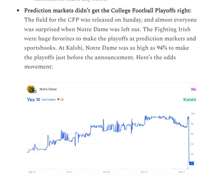 The argument is that skin in the game somehow ensures an honest appraisal of an unknown. The reality is that prediction markets are often overpromising and underdelivering, because, like everything else, they’re fallible; they’re based on probabilities, not “quintessential truth machines.”