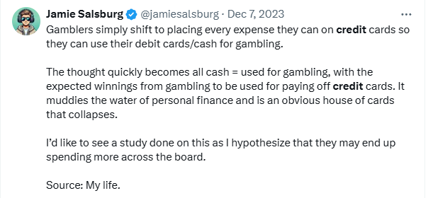 Still as I noted in a separate column, “Prohibiting credit cards sounds like a robust responsible gambling safeguard, but evidence (where available) suggests the policy has zero impact and possibly exacerbates the problem amongst at-risk gamblers… However, there is a very valid reason to impose a credit card ban, and that reason is to pass a bill — the ‘don’t let perfect be the enemy of good’ argument.”