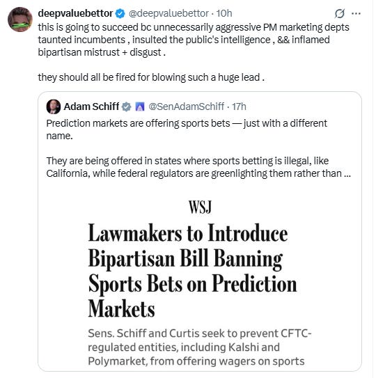 “Six months ago I would have told you that sports contracts have a 0.1% chance of being authorized by Congress, and a 0.1% chance of being restricted/prohibited. Now I would put those odds at 0.1% and 5% (given the number of Congressional letters and bills on prediction markets), and the reason is something I’ve written about in the past on a variety of different topics: Hubris.”