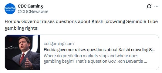 “This is something (that) really within the last year has really become a big deal,” DeSantis said. “In Florida, we kind of have a unique relationship with the Seminole Tribe of Florida. There was things done long before I was Governor to give them exclusive rights over gaming. They also have the exclusive rights over sports betting. And so the question is: Is something like Kalshi, is that clashing with the laws of the state of Florida? Or is it separate? It’s more of a prediction (market). So we’re kind of trying to get our mind around that.”