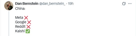 STTP’s reading of that statement is that so long as you registered in an authorized (by Kalshi) country, you can access the app from anywhere you like — I’m sure countries like China and India (where more than a third of the global population lives) will have something to say about that.