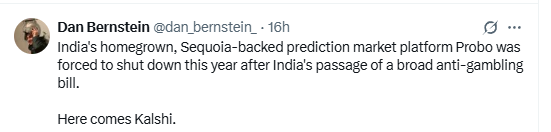 As STTP recently reported, India “passed a blanket ban on online real-money gambling, dubbed the Promotion and Regulation of Online Gaming Act 2025.” The ban extends to “virtually every form of online gambling, regardless of whether games are based on skill or chance. The bill also prohibits advertisements and financial transactions related to the gambling platforms.” That includes prediction markets, as Bernstein noted on X: