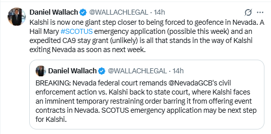 On March 2, 2026, Judge Gordon remanded Nevada’s civil enforcement action back to state court, narrowing Kalshi’s procedural options to longshot options like an emergency application to SCOTUS or an expedited stay from the Ninth Circuit to prevent the TRO from going into effect.