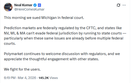 Perhaps seeing the writing on the wall, Polymarket preemptively sued Nessel and Michigan Gaming Control Board in federal court the following day. Polymarket contends that as a federally regulated entity under the Commodity Futures Trading Commission (CFTC), it is exempt from state gambling regulations, citing the Kalshi lawsuit as evidence of an “immediate threat.”
