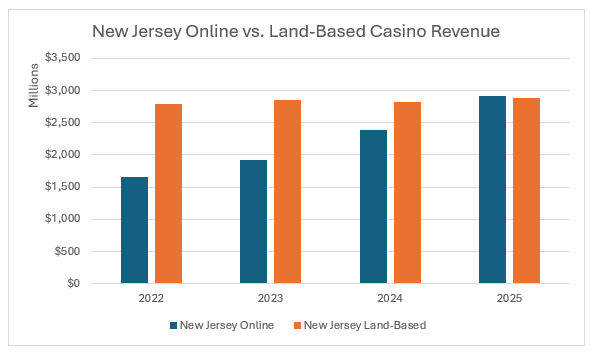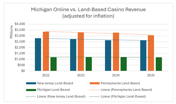 An even bigger issue that few people consider when they analyze historical trends is that online revenue growth is outpacing inflation, while land-based casino revenue looks far more concerning when adjusted for inflation.