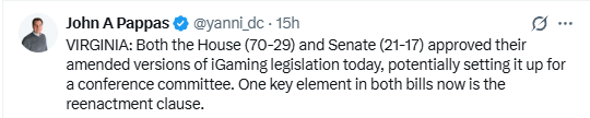 Virginia’s online casino bills (HB 161 and SB 118) are making progress, with the pair of bills seemingly heading for conference committee to work out the differences between the two bills.