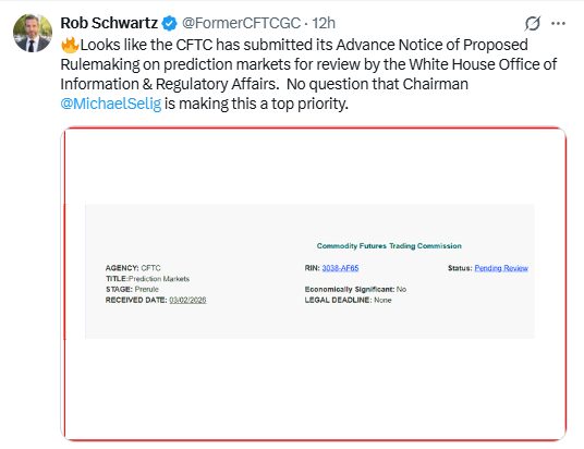 CFTC to begin rulemaking process for prediction markets [Reuters]: “The U.S. Commodity Futures Trading Commission will soon advance a proposal for regulating prediction markets, the agency’s Republican chairman said on Tuesday… The CFTC on Monday submitted an "advance notice of proposed rulemaking" (ANPR) to the president's budget office for review. An ANPR is the preliminary step that allows the agency to sound out stakeholders to help shape the first proposed draft of the rule.” More from the CFTC here.