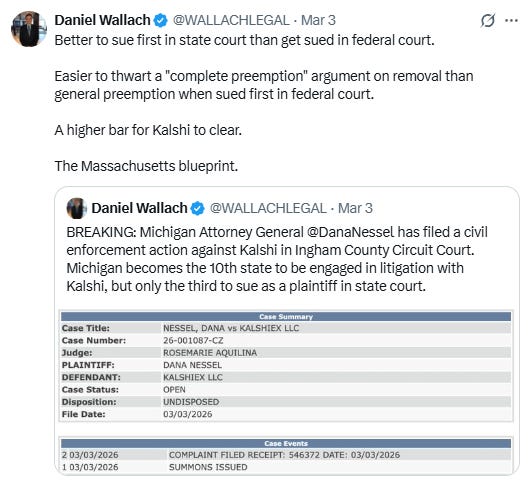 “Kalshi's attempt to remove these cases to federal court will be short-lived (see MA and NV) because the removing party must meet the higher bar of "complete preemption" to avoid remand; a general preemption argument (i.e., field, express or conflict preemption) will not suffice.