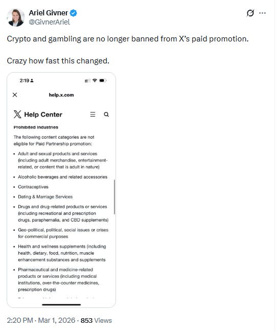 Influencers and affiliates can breathe a sigh of relief (at least for now) as cryptocurrency and gambling have been removed from the list of prohibited industries for paid promotions on X, as the official policy page for X no longer lists them as ineligible.