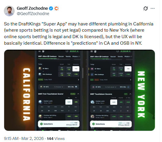 Or, as Ryan Butler put it on X, “DraftKings integrating its prediction market into its sports betting app means that all Americans (pending potential future state-level legal challenges and sports event contract bans) will have (what is now) legal access to something that looks and feels like a mobile sportsbook.”