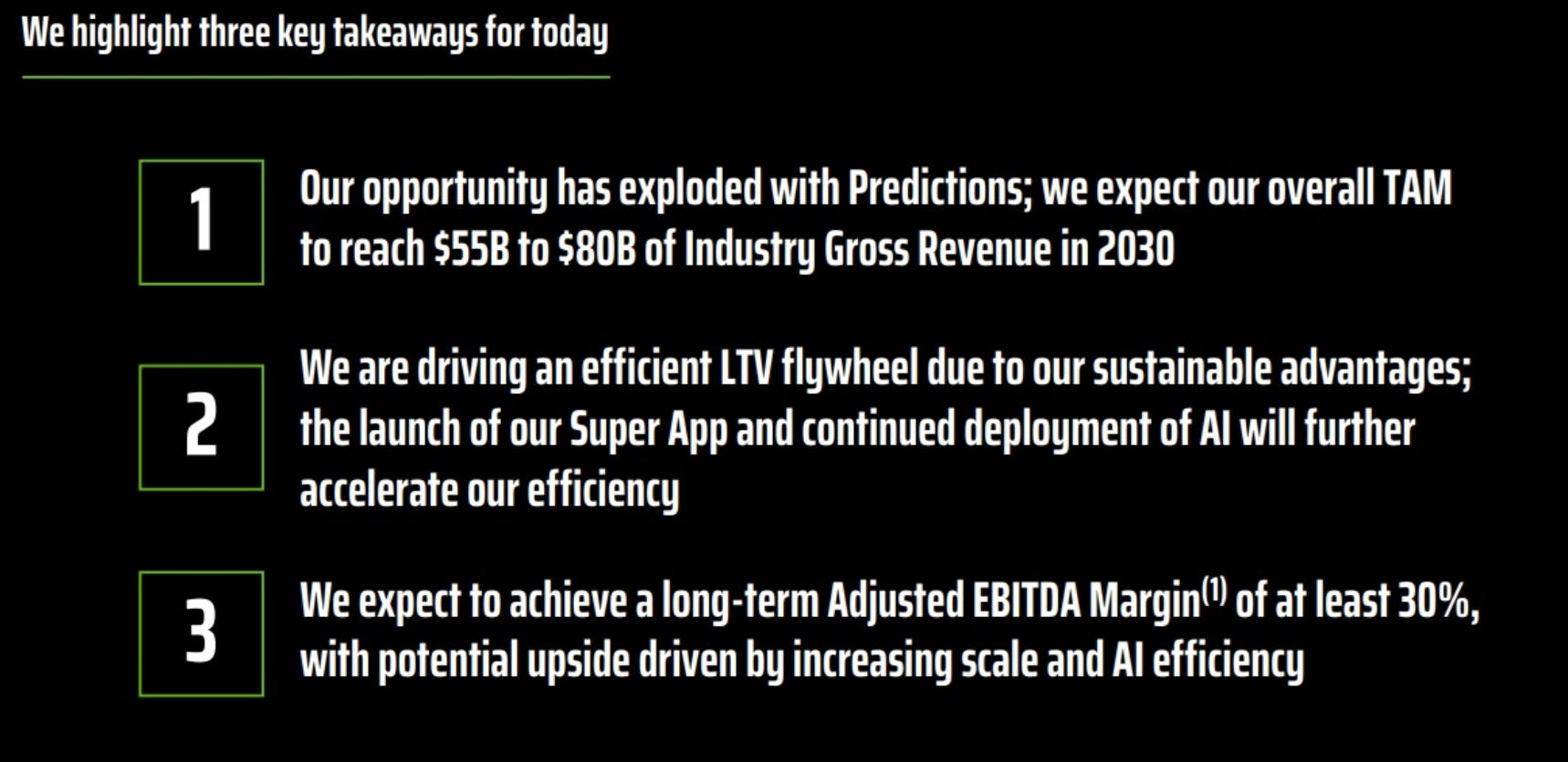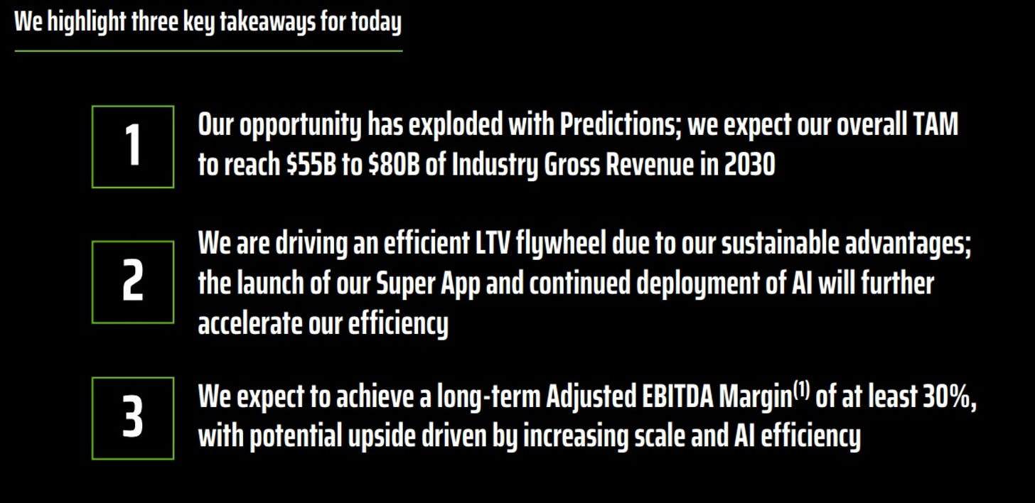 “The shift to prediction markets is another example of chasing the ball into the road. It’s unlikely to be the road to profitability in the near-term. Instead, it will extend the runway to profitability by several years, perhaps buying more time for online casino legalization to take hold, which will kick off yet another spending spree, all in the name of growth and customer acquisition.”