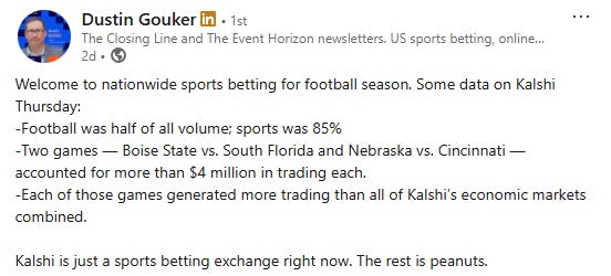 And more recently, I noted that it’s hard to call Kalshi anything other than a sportsbook: “The bulk of Kalshi’s business is on sports markets, with sports accounting for two-thirds to three-quarters of trading volume every week — a number that’s likely to go up when the NFL season starts.”
