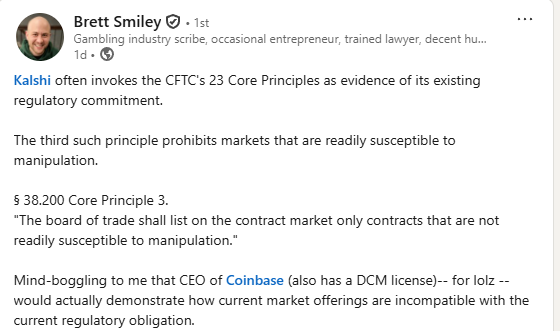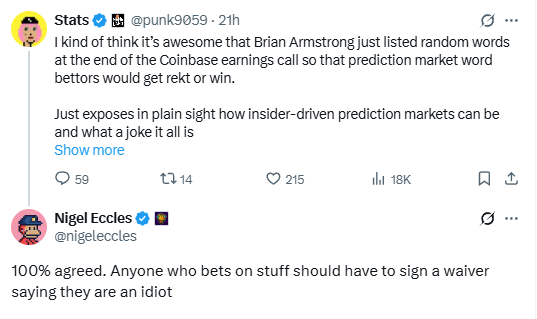 Despite the joking nature, not everyone sees the humor in it, considering $84,000 was wagered on the Coinbase mention markets, and CFTC rules are supposed to prohibit markets that are readily susceptible to manipulation: