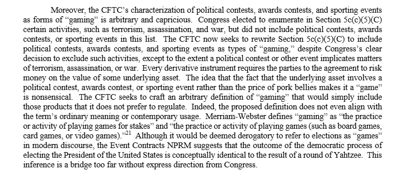 In the letter, Paradigm states, “The CFTC’s characterization of political contests, awards contests, and sporting events as forms of ‘gaming’ is arbitrary and capricious,” arguing that sporting events are not “gaming,” and therefore not covered by the CFTC regulations concerning markets that may be against the public interest.
