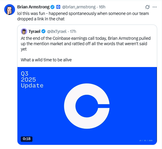 Coinbase CEO Brian Armstrong trolled the company’s recent earnings call, when he rattled off a bunch of ‘mention markets’ available on prediction market sites during the call: