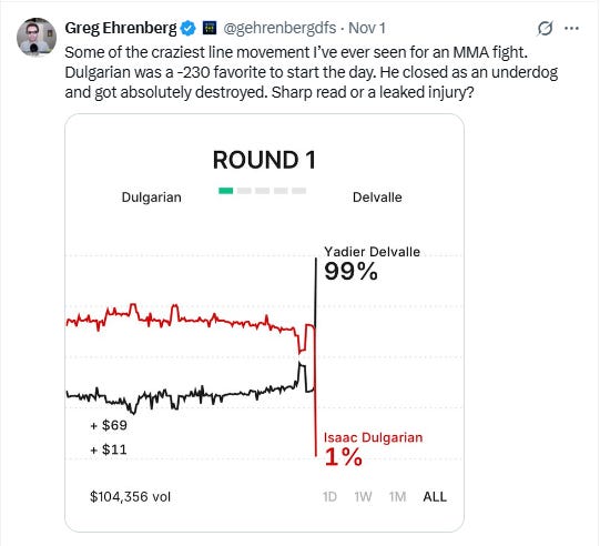 So what’s going on? The main issue stems from highly unusual betting line movements in the hour leading up to the Isaac Dulgarian vs. Yadier Del Valle at UFC Apex on November 1.