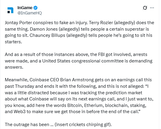 InGame’s Jeff Edelstein also penned a column on the differing treatment of licensed sportsbooks and prediction markets: NBA vs Coinbase: The Double Standard of Market Manipulation.