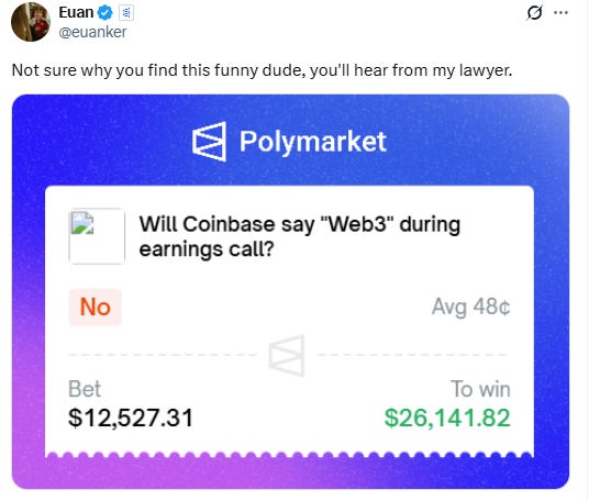 “I was a little distracted because I was tracking the prediction market about what Coinbase will say on their next earnings call. I just want to add here the words Bitcoin, Ethereum, blockchain, staking, and Web3.”